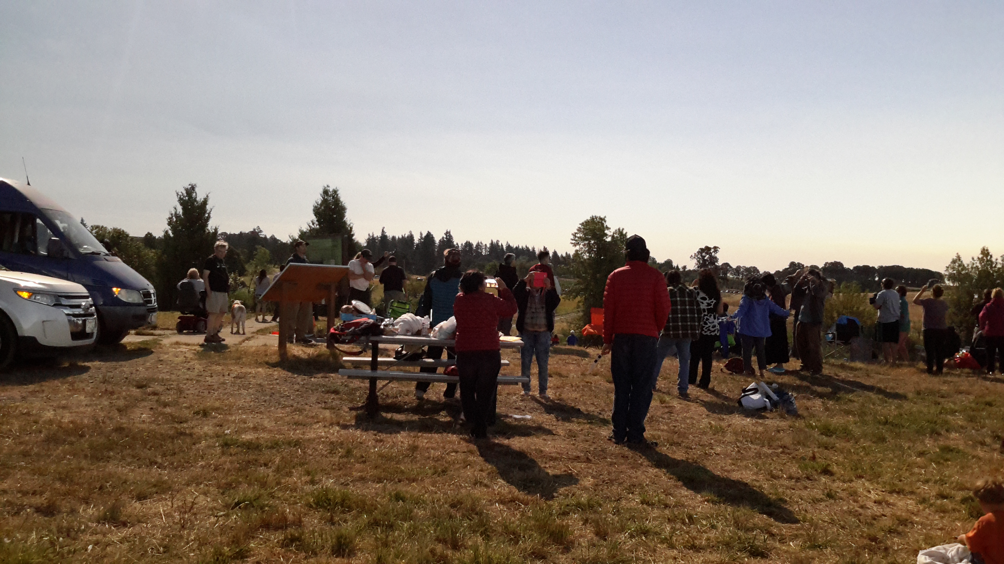 It was decided that the only way to get into the park was to leave real early the night before the event. The park was about 50 miles north of Eugene and 9 miles south of Salem OR. We left around midnight in Marc SUV and got to the park around 1:00am. The drive there was fine, only light traffic. There was already a few cars parked at the entrance gate. Since the gate opened at 6:00am we had 5 hours to kill and another 3 hours after that before the beginning of the eclipse. I did not get any sleep that night but others were able to get some sleep in before 6:00am.