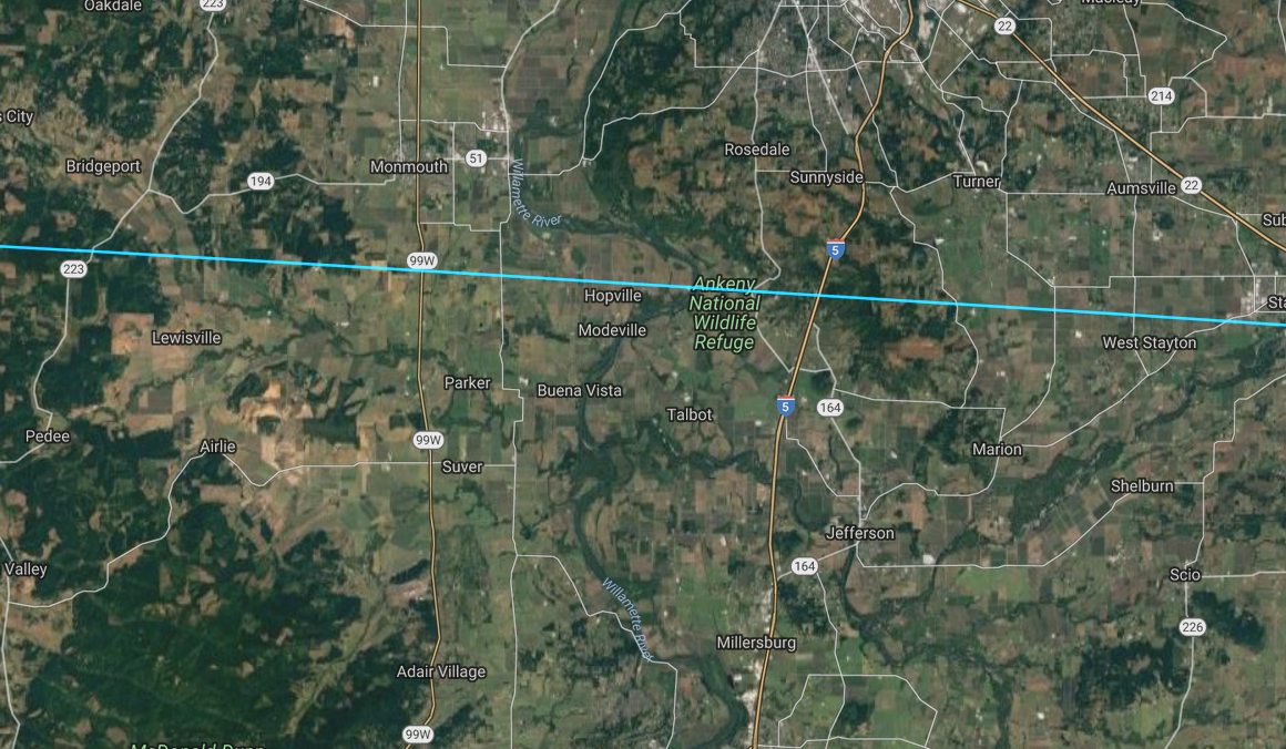 Here are some GoogleEarth images of our viewing site at the Ankeny Wildlife Refuge. We stayed at the Ankeny Overlook about 915 feet (279m) south of the center path of totality. This is the blue line in the pictures.