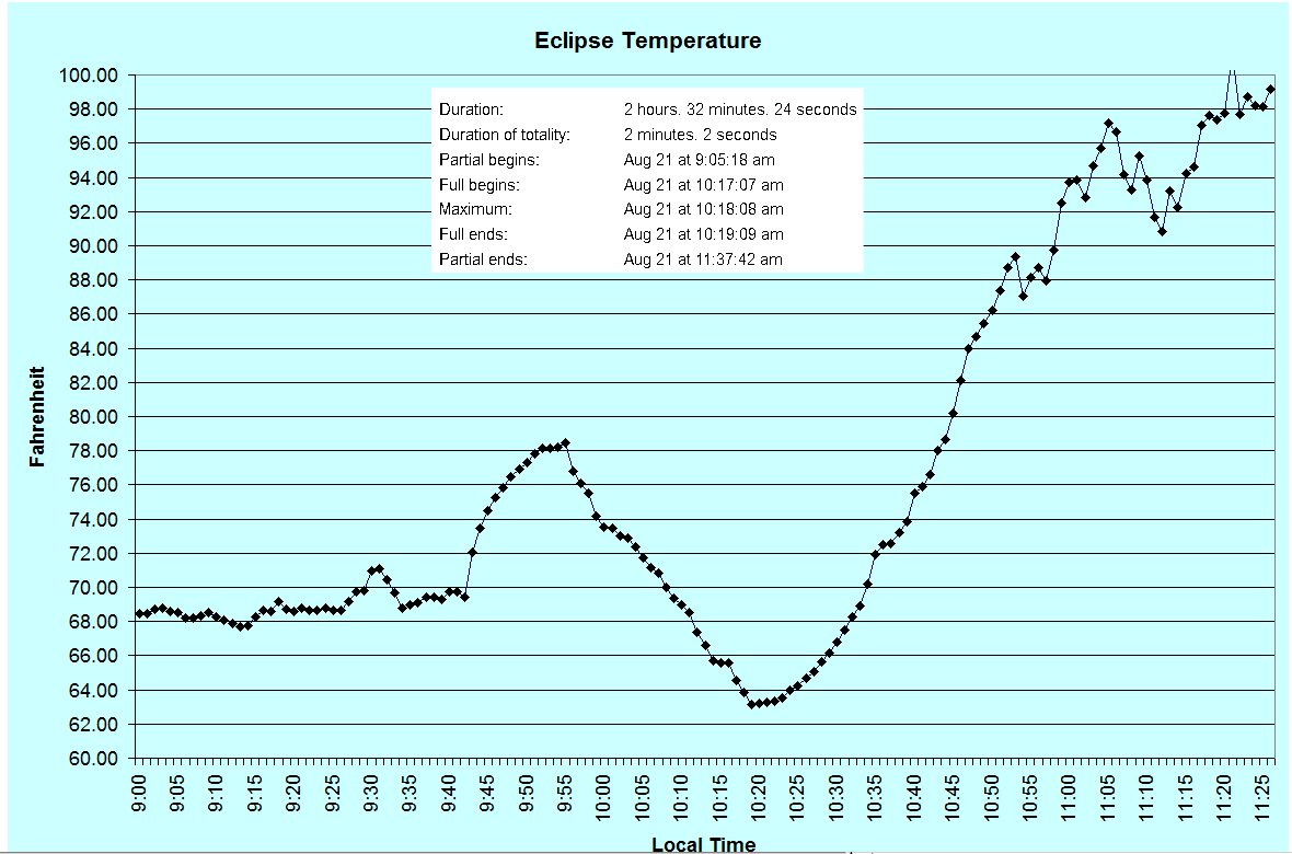 The only experiment I did during the eclipse was to measure the temperature change. As you can see from the plot below the temperature dropped around 15oF.