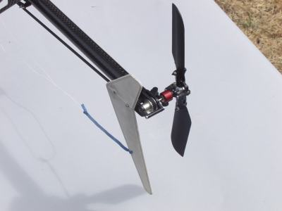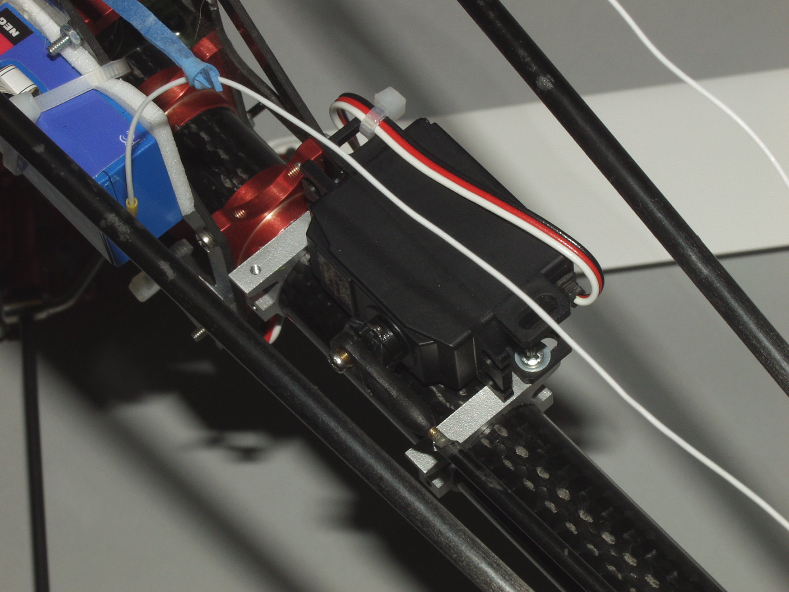 After making the changes the helicopter flew much better. The tail is now rock solid. Besides having more power another advantage with using the Digital S9650 servo is I can now use the digital output mode of the GY401 gyro. In the digital mode the gyro outputs data to the servo at a higher frame rate. This allows the gyro to better control the servo and the tail stability is increased. Below are some photos showing how I mounted the servo to the boom.