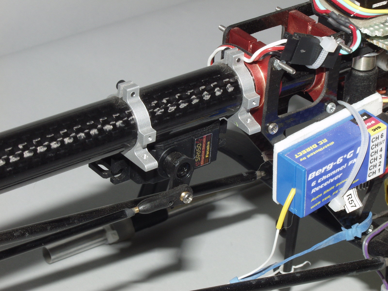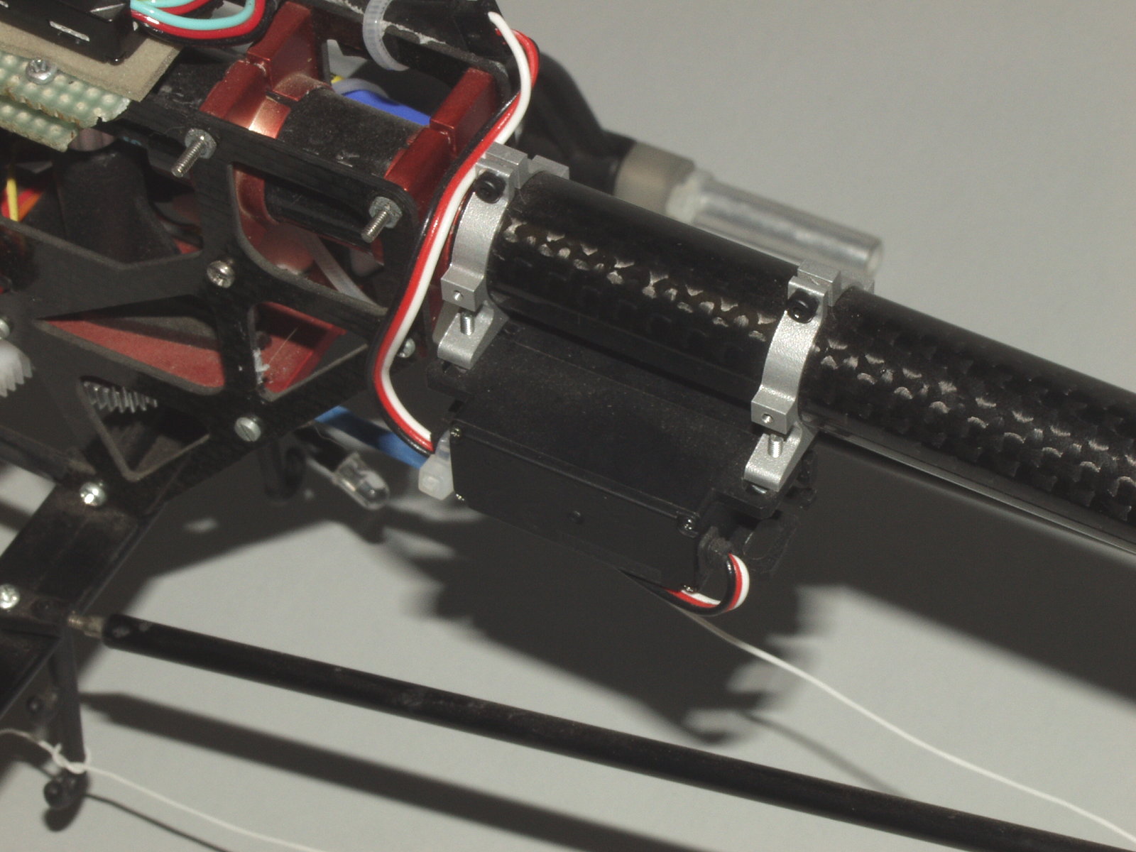 I am using two Boom Horizontal Fin Clamps available at Helihobby to mount the servo. Since the S9650 servo is larger then the HS81 the standard tail boom servo mount kit can not be used. Note, I am not using any rubber grommets. The servo is directly mounted to the clamps using two 2MM screws.