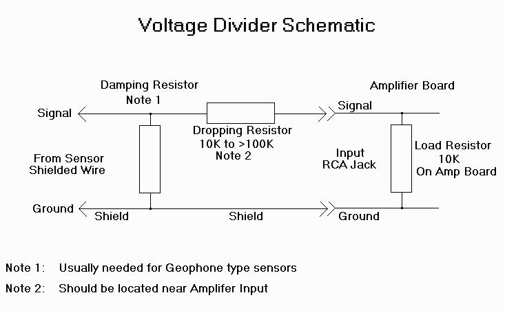 If there is still too much signal you will need to reduce the voltage from the sensor by using a resistor divider (schematic). Each channel as a 10k resistor to ground unless you specified a different input impendence. This resistor can be used as one leg of the divider. The other resistor is placed in the signal path. A 10k resistor will reduce the voltage by 2 and a 100k resistor will reduce the voltage by 10. If you have a long wire between the sensor and the input to the board the resistor in the signal path should be placed near the Amp/Filter board.