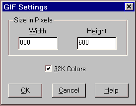 This dialog box is use to control the size of the GIF image when saving an event window as a GIF file. There is also a check box to correct color problems with the image created by WinQuake.